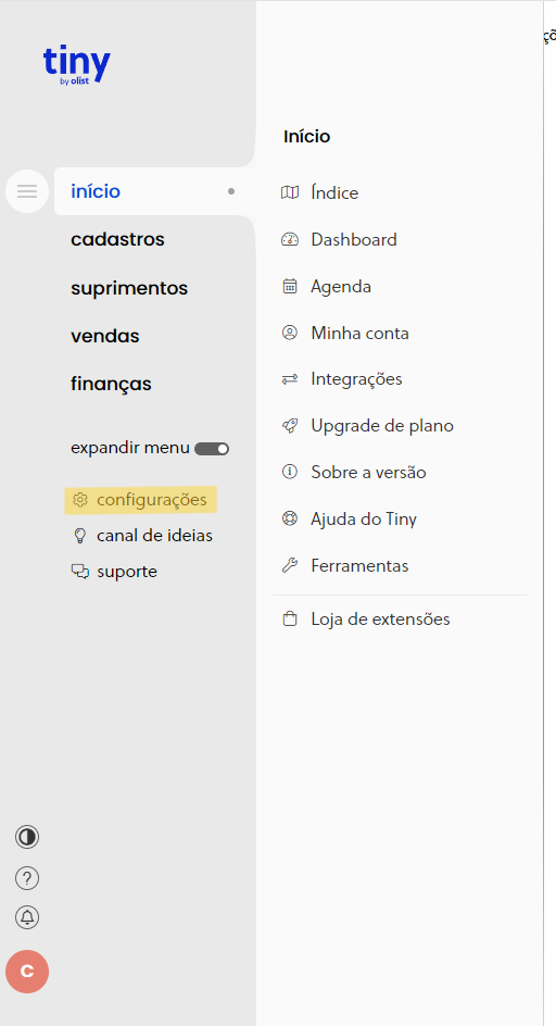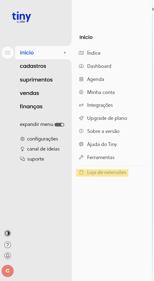 Passo 1 - Após entrar na conta do Tiny, vá para o menu e clique em Loja de extensões.