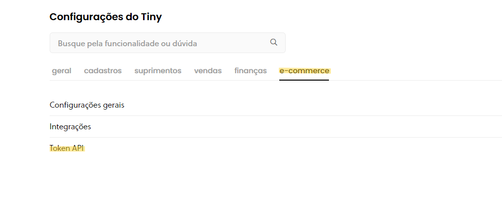 Passo 4 - Em Configurações, vá para a aba E-commerces. Dentro dessa aba, clique em Token API.