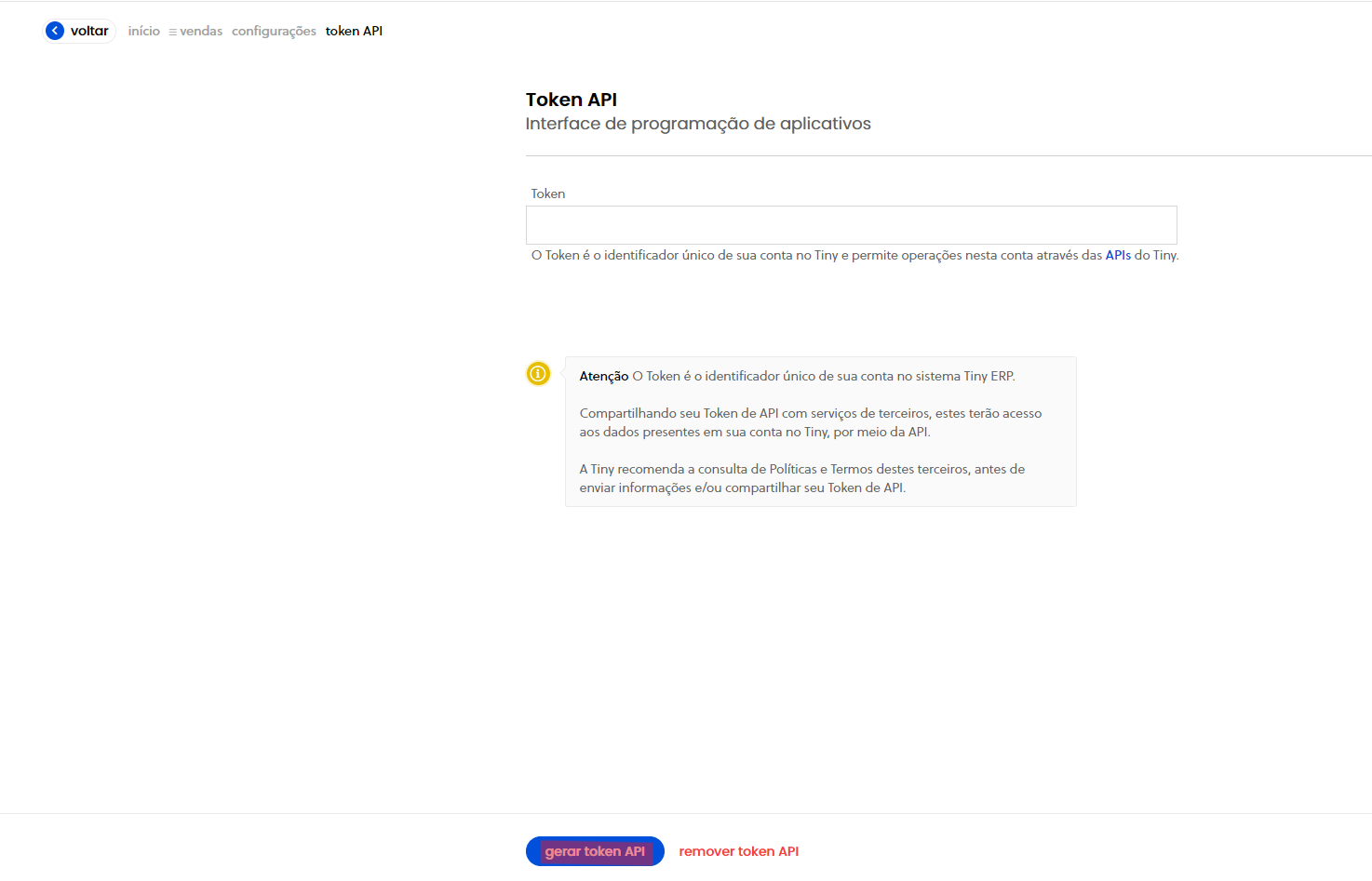 No Tiny, ao remover seu token API, todas as integrações que utilizam o código antigo, perderão a comunicação.
