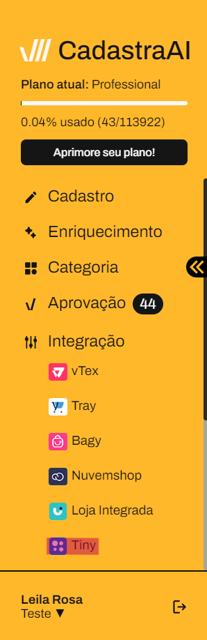 Passo 6 - Agora, no cadastra.ai, vá até o menu e clique em Integração > Tiny.